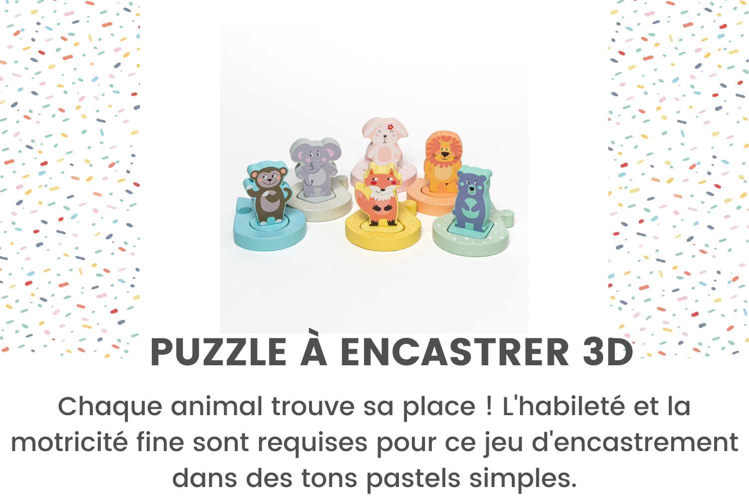 Puzzle à encastrerChaque animal doit trouver son emplacement ! L'habileté et la motricité fine sont requises pour ce jeu d'encastrement dans des tons pastel. Les figures géométriques et les couleurs sont à prendre en compte à chaque fois, car à chaque animal correspond la couleur d’un pétale !